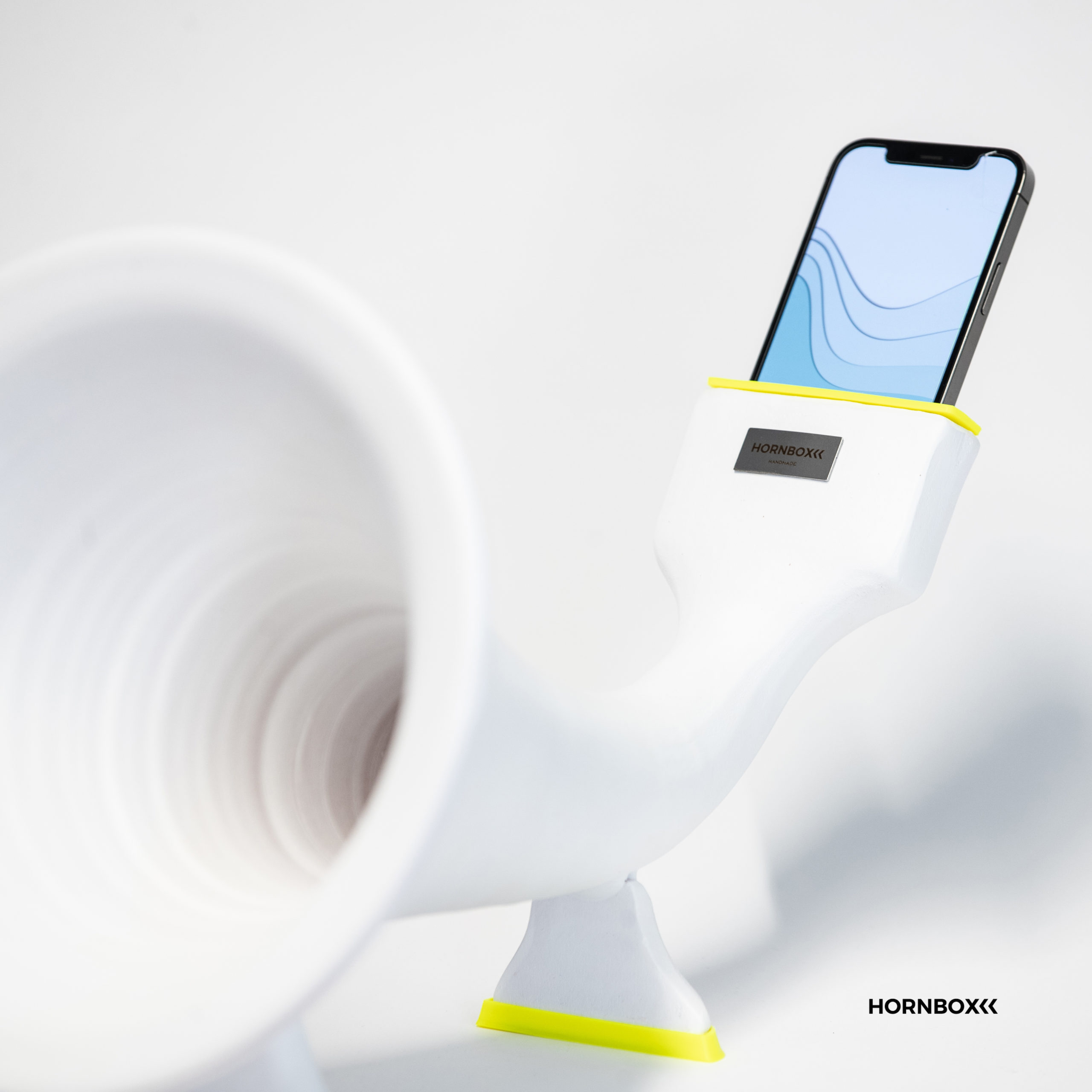 Spiele mit jeder beliebigen App deine Lieblingsmusik ab und genieße die raumfüllenden Klänge. Geniale und bewährte Technik, neu ausgedacht. Die HORNBOX ist ein handgemachtes Grammofon aus natürlichem Ton, das bequem mit einem Smartphone genutzt werden kann. Das Smartphone wird lediglich in den Schacht gelegt und die Klangverstärkung der HORNBOX erzeugt die Klang-Charakteristik von Grammofon-Wiedergaben. Ganz ohne Akku laden und Bluetooth. Hole dir das ultimative Klangerlebnis ins Wohnzimmer.